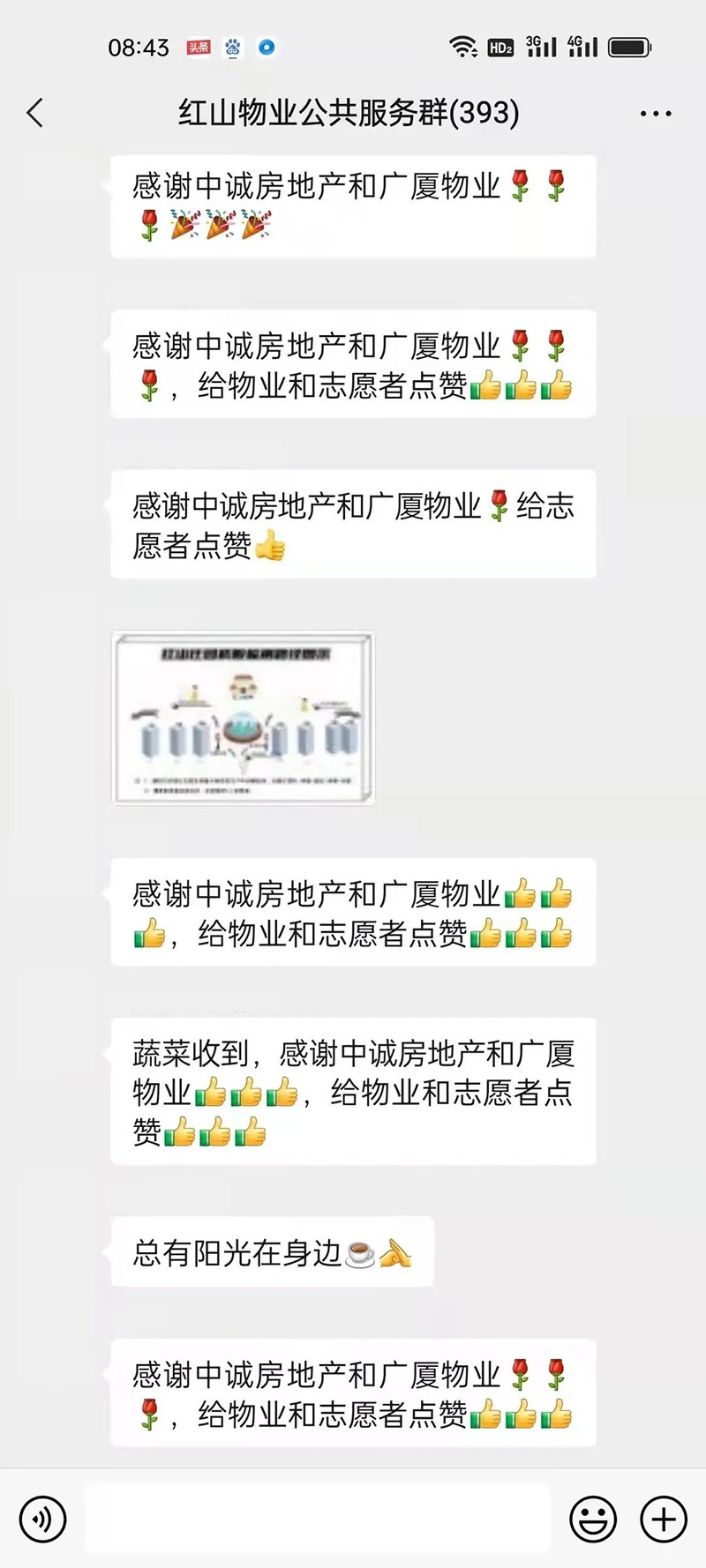 隨后,在社區志愿者的協助下,“愛心蔬菜包”安全順利地送到每一戶業主手中。看著業主群里邊對中誠公司和廣廈物業持續刷屏的稱贊與感謝,每個人都忘記了辛苦,滿臉的汗水融化成了滿臉的笑容,那勒出紅印的雙手也成為了愛心的印記。